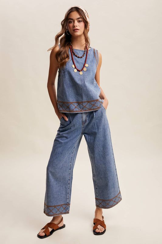Embroidered Denim Tank & Wide-Leg Pants Set LSET178